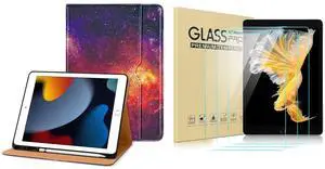 DTTO for iPad 9th/8th/7th Generation 10.2 Inch Case 2021/2020/2019, Premium Leather Business Folio Stand Cover with 3 Pack HD Clear Tempered Glass Screen Protector, Galaxy