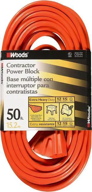 Woods 0819 12/3 Outdoor Multi-Outlet Extension Cord, 50-Foot, Orange