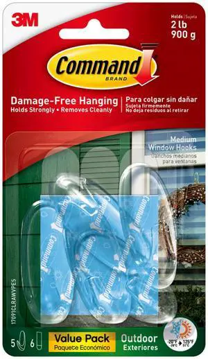 Outdoor Medium Clear Wall Hook, 5 Hooks and 6 Strips, Damage-Free Hanging Wall Hook for Hanging Outdoor Wall Decor with Weather Resistant Strips, Holds up to 2 lb