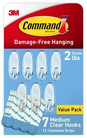 Medium Clear Wall Hook, 7 Wall Hook and 12 Strips, Damage-Free Hanging with Adhesive, Great for Hanging Home Decor, Holds up to 2 lb