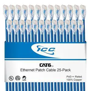 ICC CAT6 Ethernet Patch Cord with Clear Boot Strain Relief, RJ45, Stranded, 550 MHz, UTP, Pure Bare Copper Wire, 24 AWG, LAN Network Patch Cable, Blue, 3 FT, 25-Pack