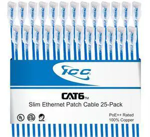 ICC CAT6 Slim Ethernet Patch Cord with Clear Boot Strain Relief, RJ45, Stranded, 550 MHz, UTP, Pure Bare Copper Wire, 28 AWG, LAN Network Patch Cable, Blue, 5 FT, 25-Pack