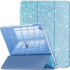 INFILAND for iPad 9th/8th/7th Generation - 10.2 inch Glitter Case, Blue with Clear Back, Pencil Holder for Kids