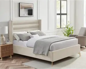 Inspired Home Laron Platform Bed - Upholstered | Wingback Channel Tufted Headboard, Oblique Legs, Cream White Velvet
