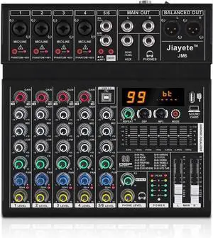 6 Channel DJ Mixer, Professional Audio Mixer, Metal, DSP 99 Preset Effects, Bluetooth Sound Board, 48V Phantom Power, Black USB Xlr Music Streaming Mini Mixing Console, Pa Mixer for PC, Podcast