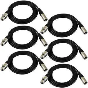 6ft Patch Cable Cords - XLR Male to XLR Female Black Cables - 6' Balanced Snake Cord - Pack of 6