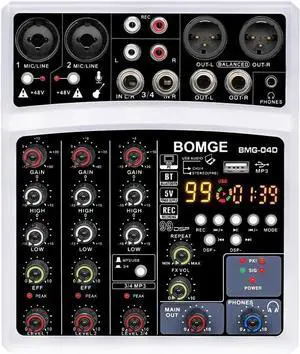 4 Channel dj Bluetooth Audio Mini Mixer with 99DSP Processor, USB Interface, Stereo Recording, 48V Phantom Power for PC,phone(White)