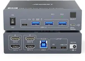 Dual Monitor KVM Switch for Laptop & Desktop 4K@60Hz, USB C and HDMI KVM Switch 2 Monitors 2 Computers with 4 USB 3.0 Port for Keyboard Mouse, 80W PD Charging, with Wired Remote and USB C Cable