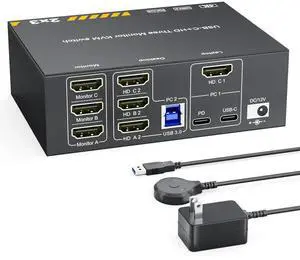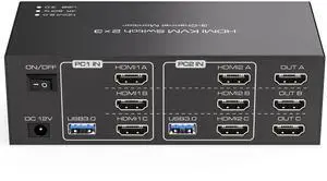 HDMI KVM Switch 3 Monitors 2 Computers 4K@60Hz KVM Switches with 4 USB 3.0 Ports for 2 Computers Sharing Triple Monitor and 4 USB Devices Support Extended & Copy Mode with 2 USB Cables