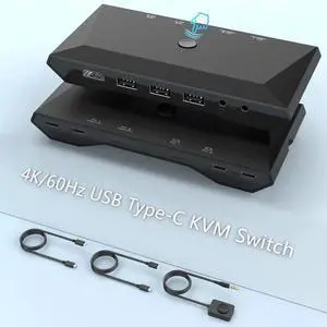 2-Port USB Type-C KVM Switch, 4K 60Hz HDMI KVM Switch 2 in 1 Out Dual USB C KVM Switch 2 Computers with HDMI, 60W PD, 3X USB 2.0, Remote Control, 3.5mm Audio/Mic for MacBook, iPad Pro, USB-C PC
