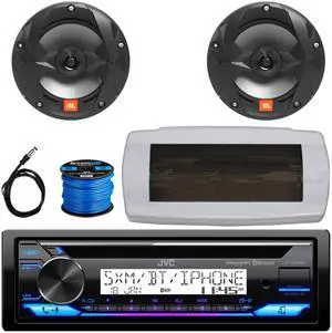 JVC KD-X560BT Single-DIN Marine Bluetooth USB/AUX MP3 AM/FM Radio Digital Media Stereo Receiver W/White Cover, 2x 6.5" 180W Max Power 2-Way Multi-Element Boat White Speakers W/50 Feet Wire, Antenna