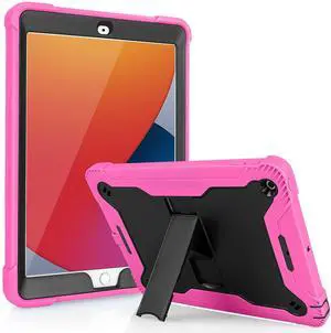 KIQ iPad 7th 8th 9th Case, Heavy Duty Rugged Bumper Dual-Layer Protection Cover with Kickstand for Apple iPad 10.2" 7th 8th 9th Gen 2019/2020/2021 [Black in/Hot Pink Out]