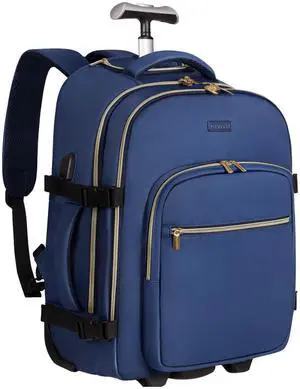DEVPNR Rolling Backpack for Women, 17Inch Laptop Travel Backpack with Wheels, Carry on Luggage Airplane, Overnight Business Bag (Dark Blue) (In Patent)