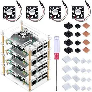 DKARDU Pi Rack Case for Raspberry Pi 4/3/2 Model B, Acrylic, White, 4 Layers, with Cooling Fan and Heatsinks