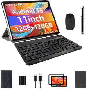 11 Inch Tablet with Keyboard, Android 15 Tablets, 12GB+128GB, 1TB Expand, 8000mAh Battery, 5MP+8MP Camera, Dual Band WiFi 6, IPS Touch Screen, Mouse/Stylus/Case/Charger Inside, Great Gift -Black Set