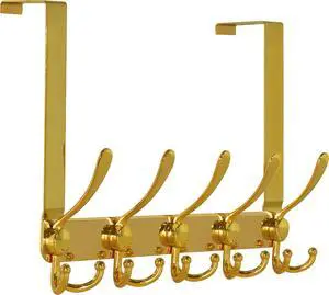 Over The Door Hook Hanger - Fits 1 3/8 to 1 3/4 Standard Doors | 5 Tri Hooks Heavy Duty Towel/Coat Rack | Door Organizer for Clothes Jackets Hats Towels Gold