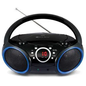 SINGING WOOD SBX030C Portable CD Player Boombox with AM/FM Stereo Radio, Aux Line-in, Headphone Jack, Top-Loading Disc Player, AC or Battery Powered, Foldable Handle (Black with Blue Rims)