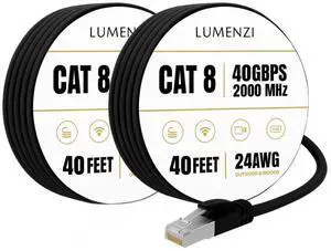 Lumenzi Cat8 Round Ethernet Cable 40ft, 2 Pc Pack, 40Gbps 2000MHz Network Patch Cord, S/FTP Shielded LAN Cable with RJ45 Connectors, for Gaming, Router, Modem, Laptop