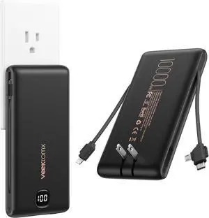 All in One Travel Portable Charger with Built-in AC Plug & Cables 10000mAh Slim Power Bank Battery Pack 15W Fast Charging Compatible with iPhone Android-White