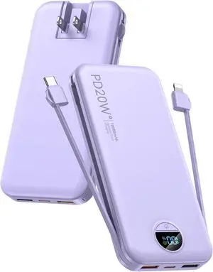 Portable Charger 10000mAh PD20W USB C Fast Charging Power Bank with Built-in Cables and AC Wall Plug Smart LED Display Travel Essentials Battery Pack Compatible with iPhone iPad etc Purple
