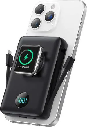 Magnetic Portable Charger 10000mAh Power Bank 5 in 1 Portable Charger with Built in Cable 20W Fast Charging for Magsafe Battery Pack Compatible with iPhone 17/16/15/14/13/12 Pro/Pro Max-Black