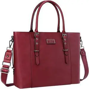MOSISO PU Leather Laptop Tote Bag for Women (17-17.3 inch), Waterproof Large Capacity Business Work Briefcase Shoulder Laptop Bag, Wine Red