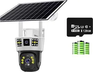 6K 12MP HD Three Lens Wireless WiFi Solar Camera Outdoor Security Protection CCTV Surveillance PTZ Color Night Vision Webcam(WiFi Cam 128G Card)
