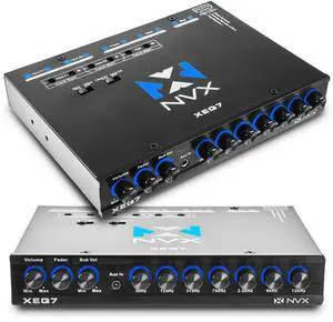 NVX 7-Band XEQ7 Graphic Equalizer with Front 3.5mm Aux Input, Dual RCA Inputs, Subwoofer & Volume Controls, Gold-Plated Contacts, Blue Illumination, Compatible with XUBT3 Bluetooth Knob