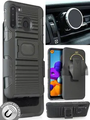 Black Rugged Case Cover Belt Clip and Magnetic Car Mount for Samsung Galaxy A21