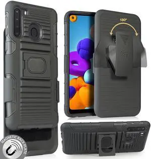 Black Rugged Finger Grip Case Stand and Belt Clip Holster for Samsung Galaxy A21