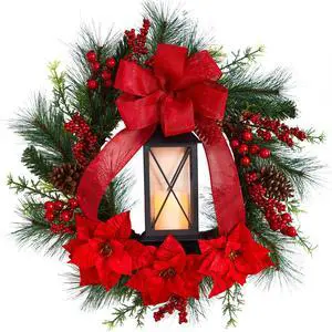 Nearly Natural 28" Poinsettia and Berry Christmas Wreath w/ LED Candle
