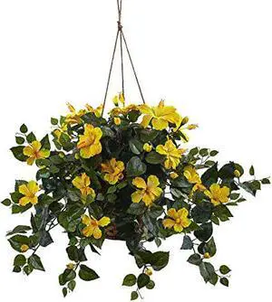 Nearly Natural 6866-YL 22in. Hibiscus Hanging Basket,Yellow,10.125 x 17.5 x 10.125