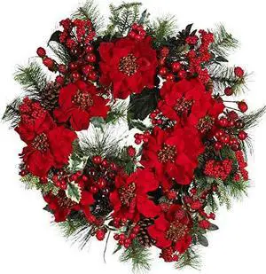 Nearly Natural 24in. Poinsettia Wreath, 24 in. W x 4 in. D x 24 in. H, Holiday