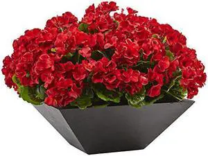 Nearly Natural 15in 15" Geranium with Black Planter UV Resistant (Indoor/Outdoor), 20 in. W x 20 in. D x H, Red