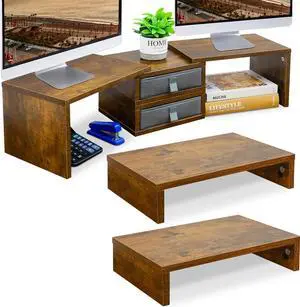TEAMIX 2 Pack and 2 Drawers Rustic Brown Wood Monitor Stand Riser for 2 Monitors/Laptop/PC, Wood Screen/TV Stand Desk Organizer.