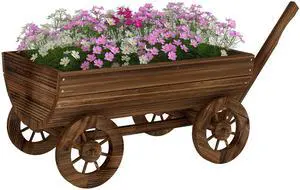 Wooden Wagon Planter Box, Mobile Garden Planter with 4 Wheels, Small Wheelbarrow Wagon Flower Cart with Drainage Hole