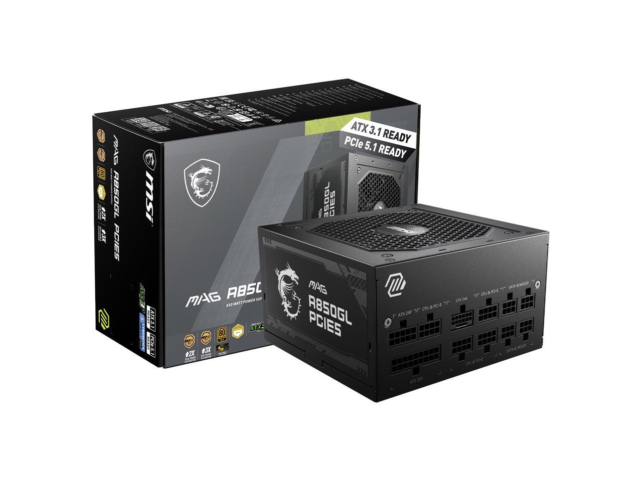 The MAG A850GL PCIE5 power supply offers 80 PLUS Gold-certified energy efficiency, ATX 3.0 compatibility, PCIe 5.0 GPU support (up to 600W), and a Fluid Dynamic Bearing (FDB) fan for quiet and stable performance.