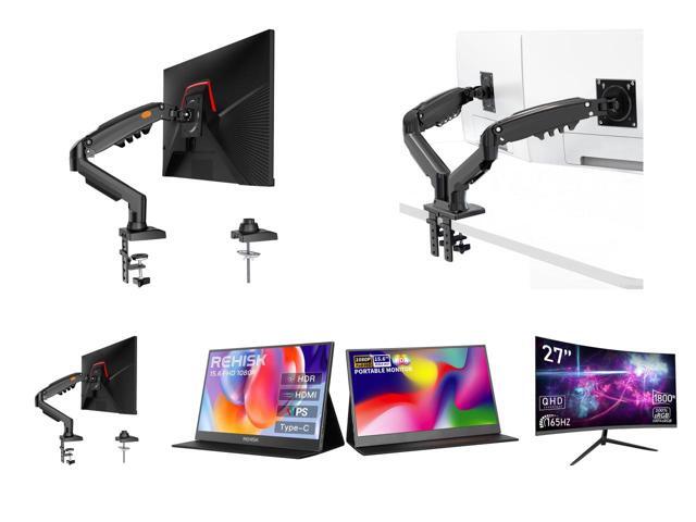 2 x Single Monitor Mount, 17 to 32 Inch, 4.4 to 19.8lbs, Adjustable Gas Spring Monitor Arm with Cable Management, Clamp & Grommet Base and 1 x Dual Monitor Mount for 15-32 Inch Screens, Adjustable Gas Spring Arm, 4.4-19.8lbs per Screen, Cable Management, Clamp & Grommet Base Heavy Duty and 1 x ReHisk 15.6 inch Portable Monitor IPS FHD 1080P HDR gaming monitors for laptop with HDMI USB-C Computer Second External Monitor Eye Care dual speakers for PC Phone PS4 Xbox black and 1 x REHISK 15.6" inch Portable Monitor IPS FHD 1080P gaming monitor for laptop with HDMI USB-C HDR Eye Care laptop monitor extender for PC Phone PS4 Xbox dual speakers and 1 x Rehisk 27'' Curved 2K Gaming Monitor 165Hz 2560*1440 1ms Response Time AdaptiveSync with Dual HDMI & DP1.2 Ultra-Slim Bezel