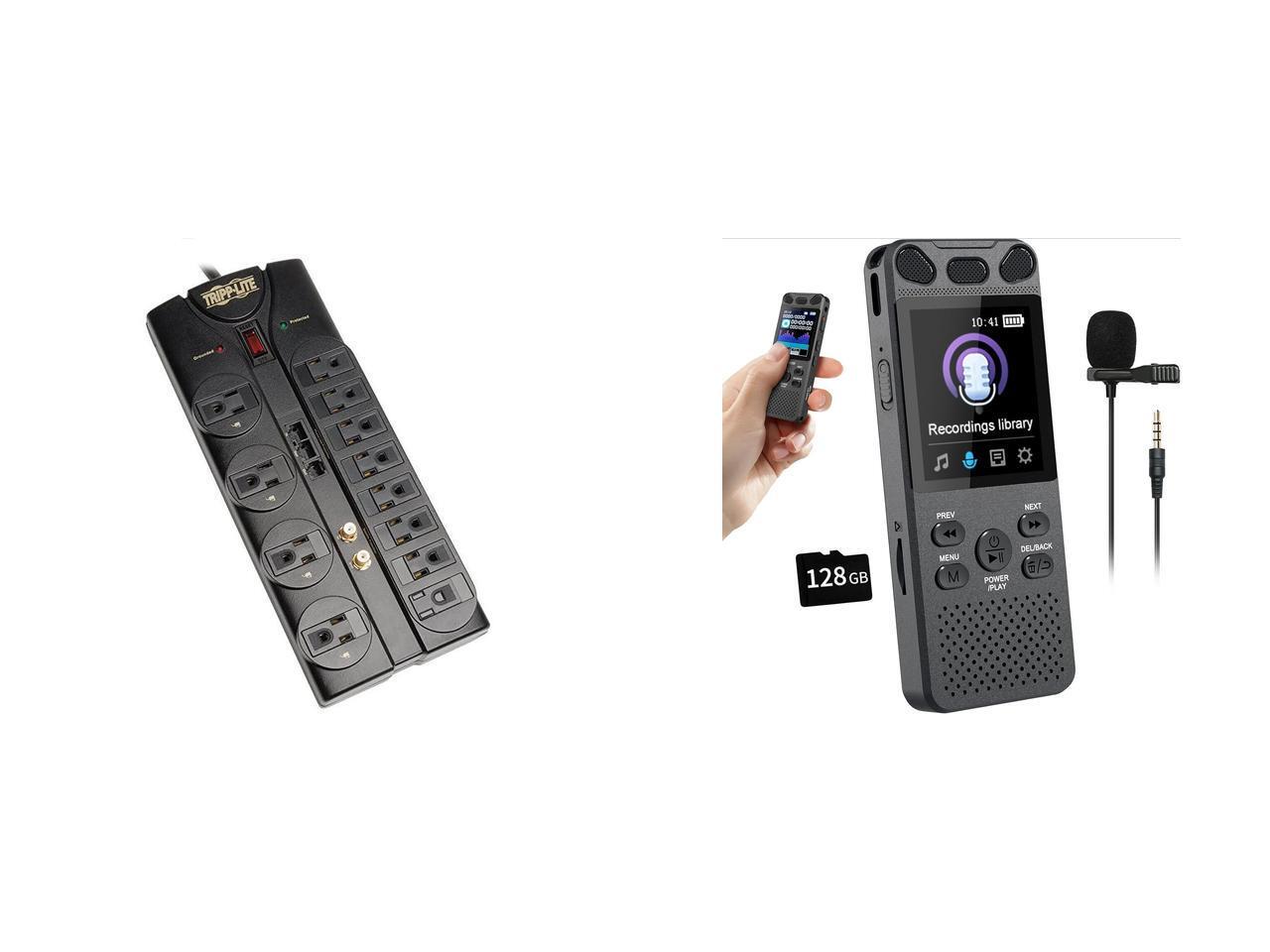 FOR-12 Outlet Surge Protector Power Strip 8ft Cord RightAngle Plug TelModemCoaxEthernet Protection RJ11 RJ45 $250000 INSURANCE TLP1208SAT Black and 1 x FOR-160GB Digital Voice Recorder with Playback - 110 Hours Ultra-Long Continuous Recording, 1536Kbps Voice Activated Audio Recorder with External Microphone for Lecture Interview Meeting