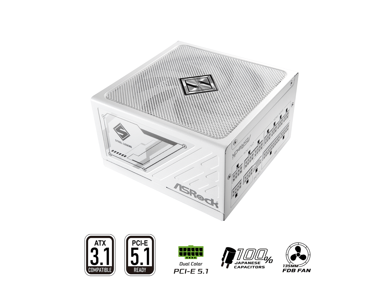 ASRock Steel Legend SL-850GW 850W 80 PLUS GOLD & Cybenetics PLATINUM Full Modular Power Supply, ATX3.1 & PCIe5.1 Ready with Dual Color 12V-2x6 Cable, 10 Years Warranty, White Edition