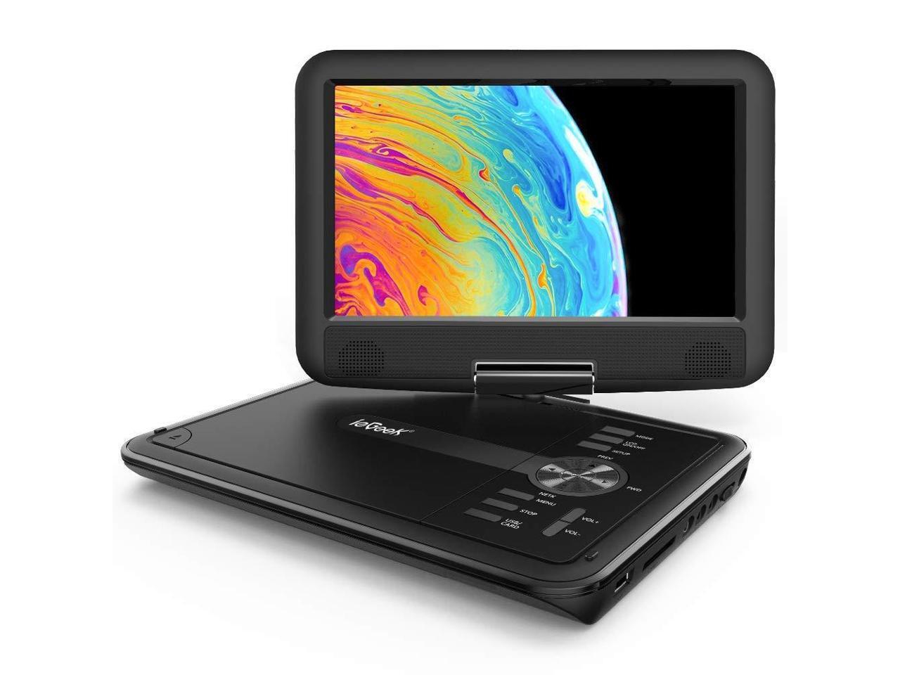 - Portable and Magical Compact design makes it easy to carry with you. Take it on your road trip and get double surprises both on and off the screen. The ieGeek portable DVD player can be easily swiveled into a tablet and mounted to the car headrest, bringing tons of fun to your journey.