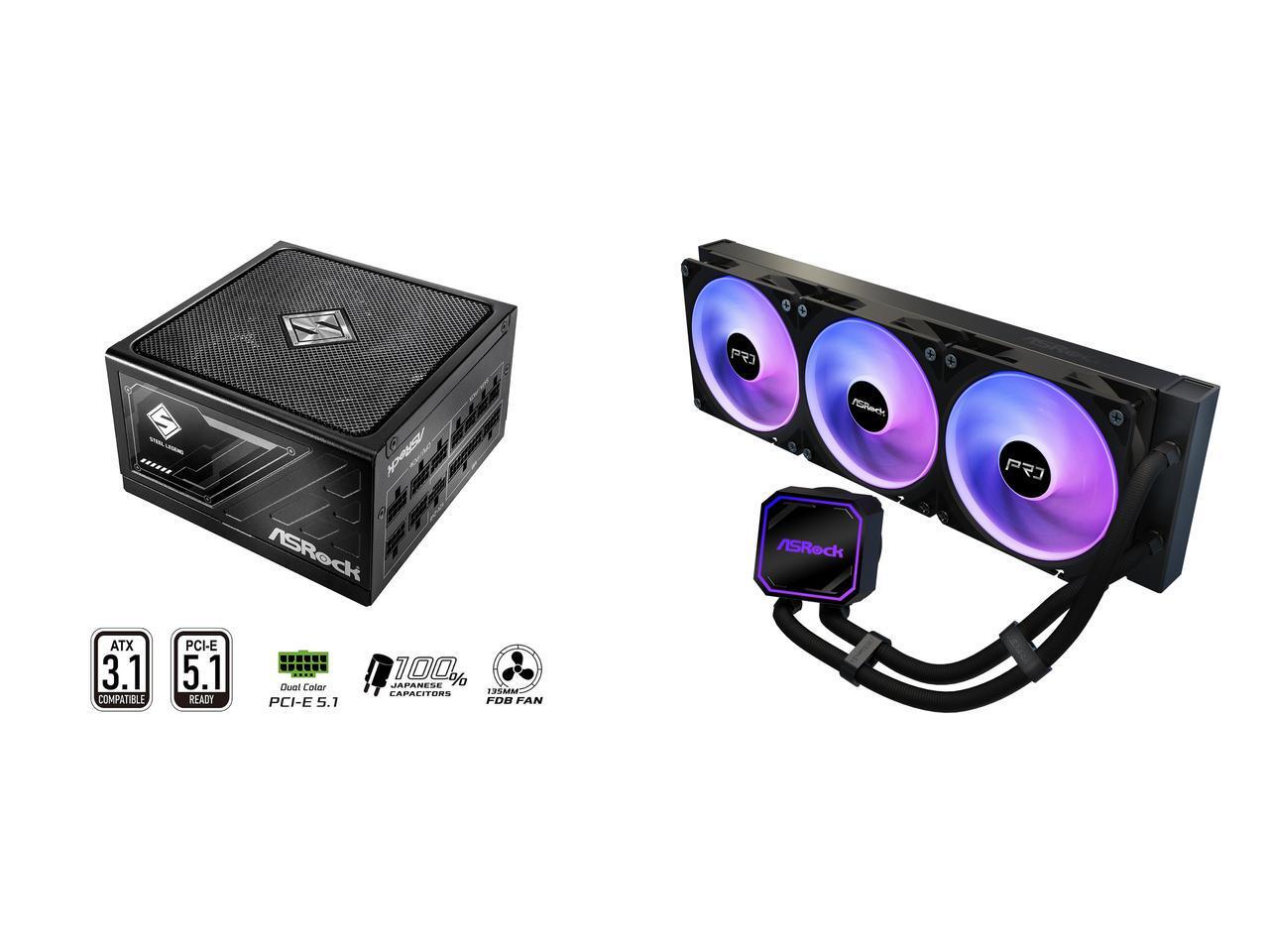 ASRock SL-1000G 1000W Power Supply ASRock AIO PRO 360 ARGB 27mm radiator, ARGB waterblock, ARGB Hub-lighting fan, black version