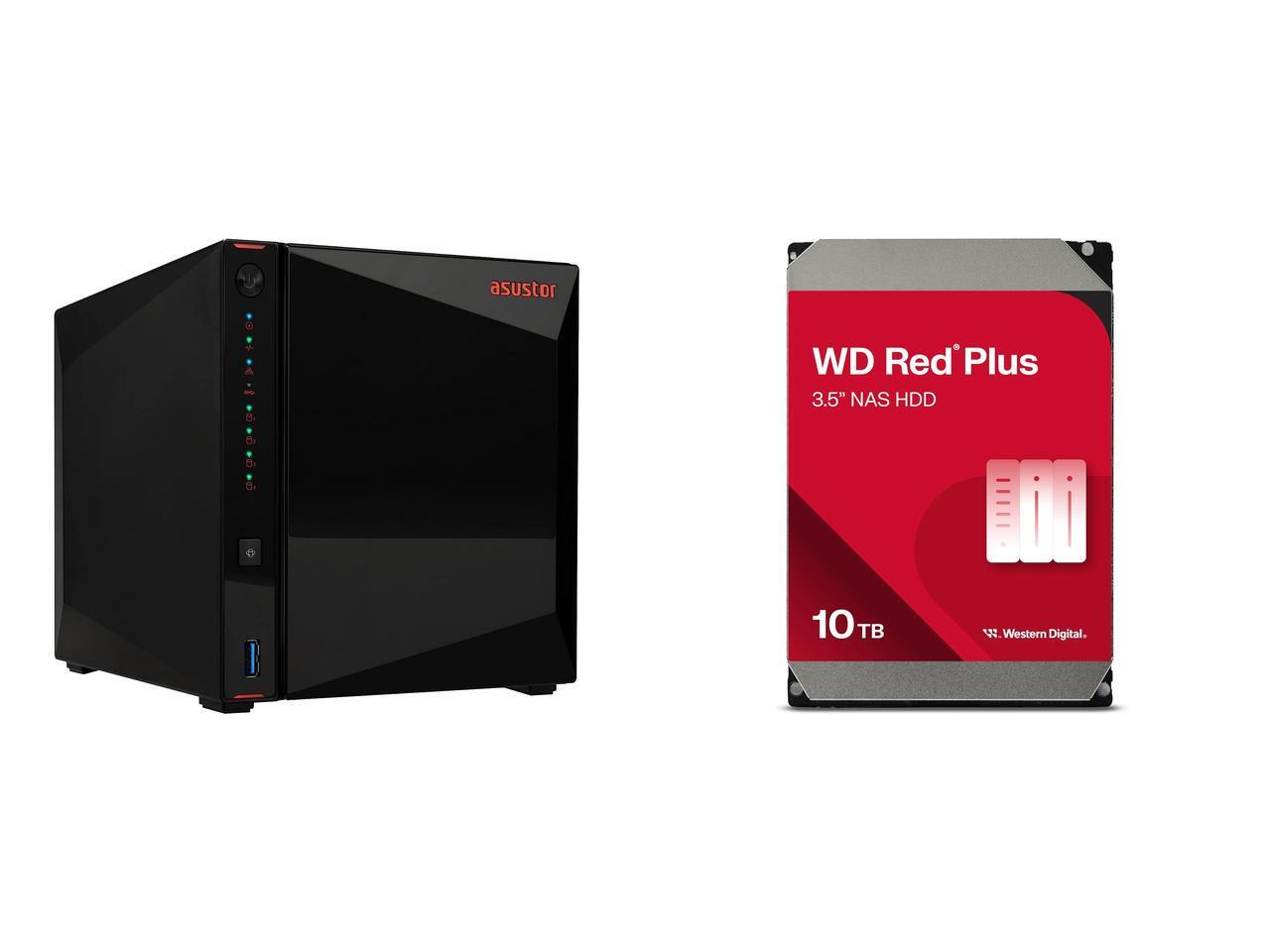 Asustor Nimbustor 4 Gen2 AS5404T 4 Bay NAS, Quad-Core 2.0GHz CPU, Dual 2.5GbE Ports, 4GB DDR4, Four M.2 SSD Slots (Diskless) WD Red Plus 10TB NAS Hard Disk Drive - 7200 RPM Class SATA 6Gb/s, CMR, 512MB Cache, 3.5 Inch - WD100EFGX