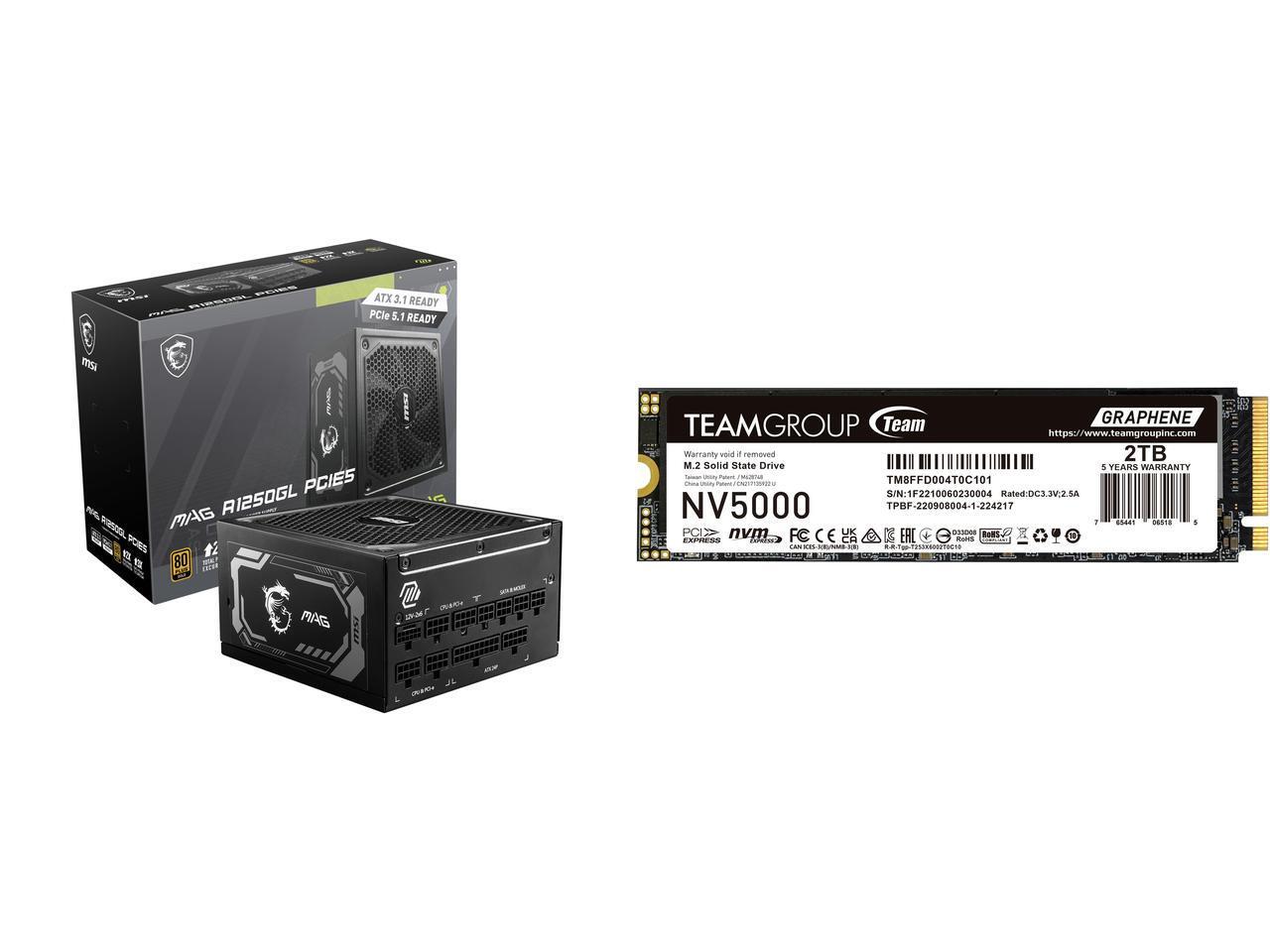 MSI MAG A1250GL PCIE5, Fully Modular Compact Gaming 1250W Power Supply, 80+ Gold, ATX 3.1 & PCIe 5.1 Ready, Native Dual-color 12V-2x6 cable, 10 Year Warranty Team Group NV5000 M.2 2280 2TB PCIe 4.0 x4 with NVMe Internal Solid State Drive (S