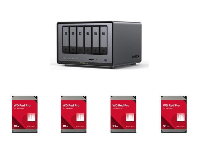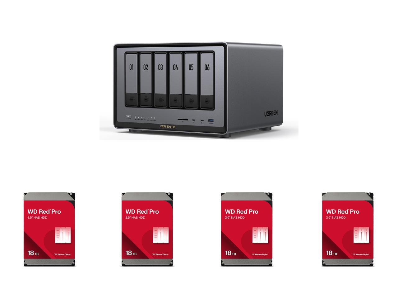 UGREEN NASync DXP6800 Pro, 6-Bay Thunderbolt™ NAS with Inte® l 10-Core i5 CPU (Up to 4.40 GHz), 8GB DDR5, 4x M.2 PCIe Slots, 1x 2.5GbE, 1x 10GbE, 2 TBT4, SD Slot (Diskless) 4 x Western Digital 18TB WD Red Pro NAS Internal Hard Drive HDD - 7