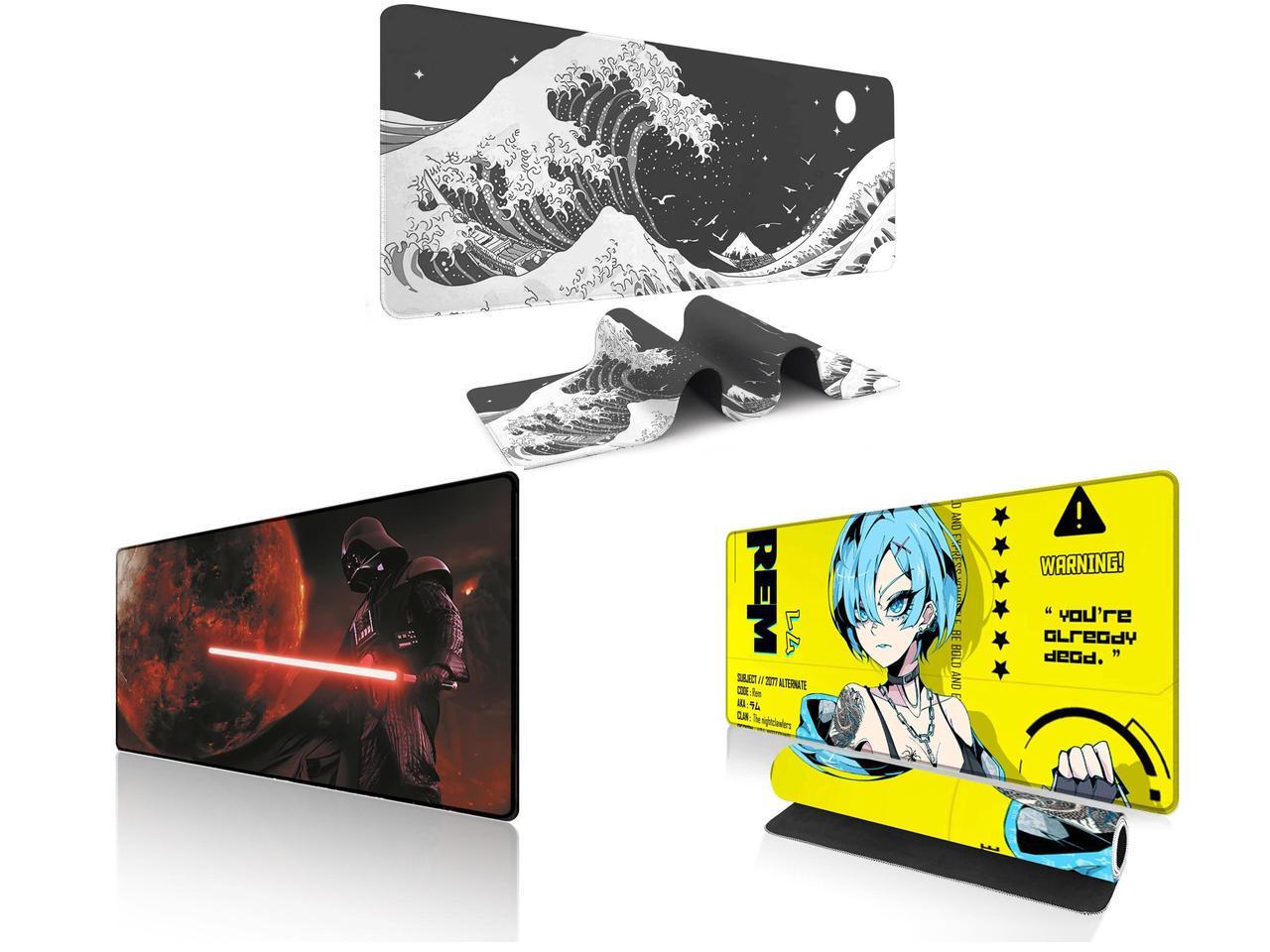 Alpha Fit Black & White Great Wave Gaming Mouse Pad XXL (35.4" x 15.7") - Monochrome Ink Wash Japanese Art Desk Mat - Minimalist Setup with Stitched Edges and 1 x Alpha Fit Starwar Gaming Mouse Pad XXL (31.5" x 11.8") - Star Wars Themed Large Mouse Pad - Extra Large Gaming Mouse Pads with Non-Slip Rubber Base & Stitched Edges for Sci-Fi Setup and 1 x Alpha Fit Anime Gaming Mouse Pad XXL (35.4" x 15.7") - Cyberpunk Blue Haired Girl - Large Mouse Pad Extended - Extra Large Gaming Mouse Pads Yellow Caution Style - 07