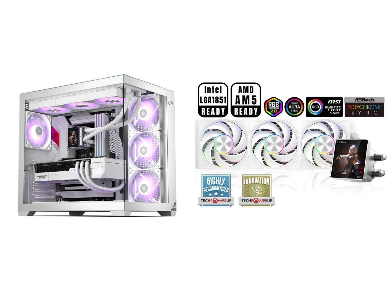 PCCOOLER CPS C3 T700 PC Case, Dual-Chamber Mid-Tower ATX Case, High-Airflow Computer Case, BTF Motherboard Supports, Sturdy Tempered Glass Front & Side Panels, White (Fans Not Included) and 1 x PCCOOLER CPS DT360 ARGB Display AIO CPU Liquid Cooler, 360mm Radiator, 320W TDP, Customizable & Magnetic 3.4" IPS LCD Display, Ceramic Bearing, for Intel LGA 1851/1700/1200/115X & AMD AM5/AM4, White
