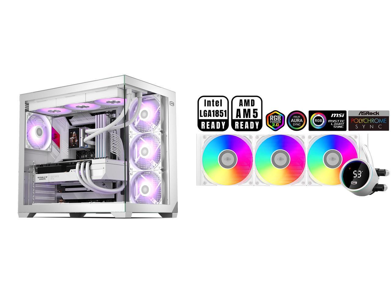 PCCOOLER CPS C3 T700 PC Case, Dual-Chamber Mid-Tower ATX Case, High-Airflow Computer Case, BTF Motherboard Supports, Sturdy Tempered Glass Front & Side Panels, White (Fans Not Included) and 1 x PCCOOLER CPS DA360 Pro ARGB Digital AIO CPU Liquid Cooler, 360mm Radiator, 300W TDP, 270° Rotatable Digital Display, Infinity Halo ARGB Effect, for Intel LGA 1851/1700/1200/115X & AMD AM5/AM4, White