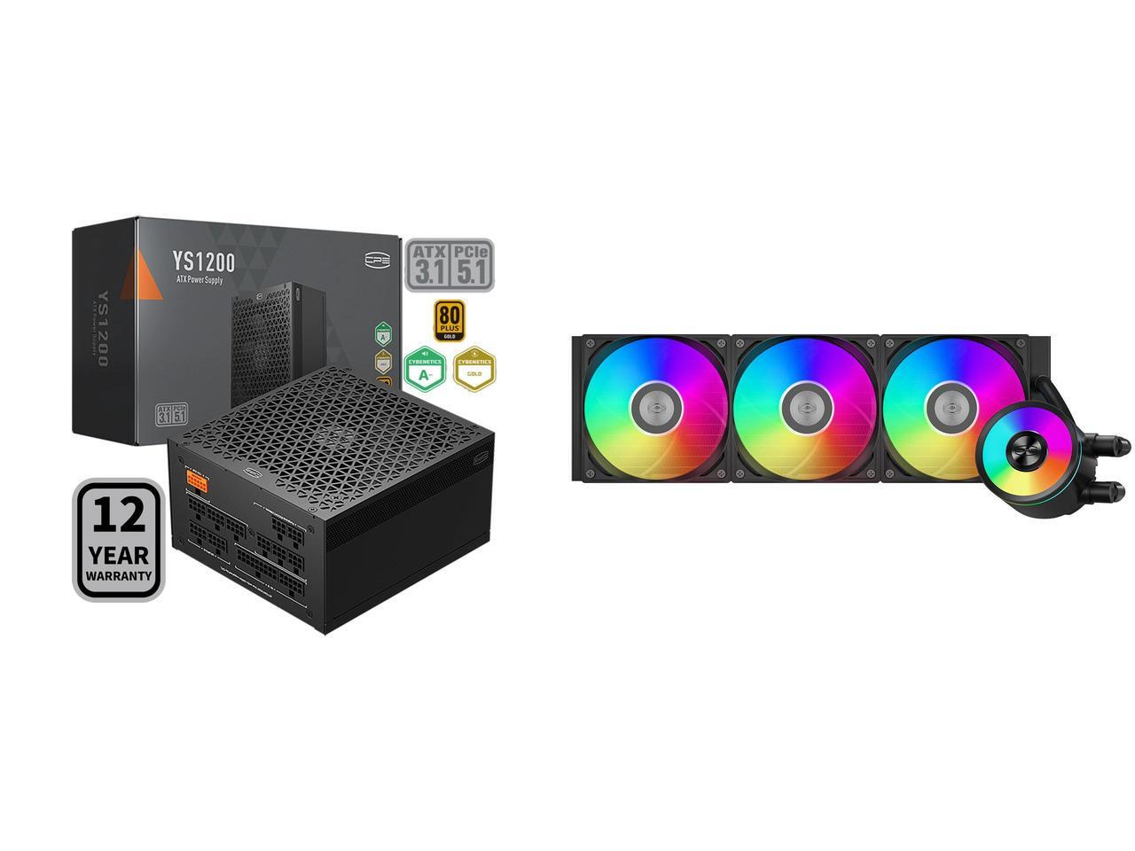 PCCOOLER CPS YS1200 Fully Modular Power Supply, 80 PLUS Gold 1200W PSU, 12V-2x6 Cable, ATX 3.1 & PCIe 5.1 Ready, 105°C Rated Japanese Capacitors, ECO Mode, 135mm FDB Fan, 12 Years Warranty and 1 x PCCOOLER CPS DA360 Pro ARGB AIO CPU Liquid Cooler, 360mm Radiator, 300W TDP, 360° Rotatable Waterblock, Infinity Halo ARGB Effect, for Intel LGA20XX/1851/1700/1200/115X & AMD AM5/AM4, Black
