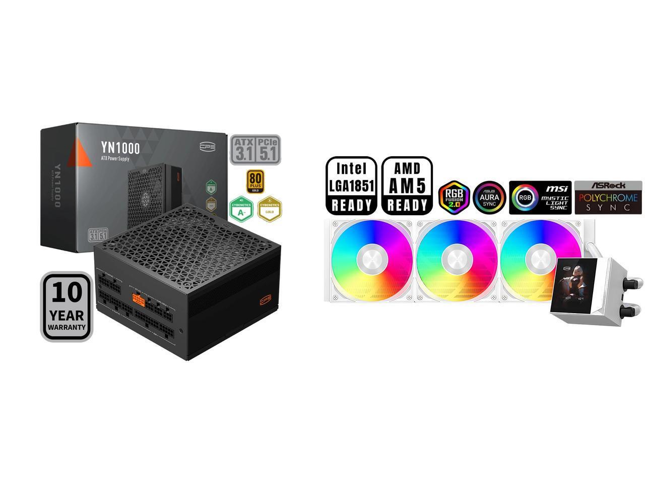 PCCOOLER CPS YN1000 Fully Modular Power Supply, 80 PLUS Gold 1000W PSU, 12V-2x6 Cable, ATX 3.1 & PCIe 5.1 Ready, 105°C Rated Japanese Capacitors, ECO Mode, 135mm FDB Fan, 10 Years Warranty and 1 x PCCOOLER CPS DC360 Pro ARGB Display AIO CPU Liquid Cooler, 360mm Radiator, 310W TDP, Customizable 2.4" IPS LCD Display, Ceramic Bearing, for Intel LGA 1851/1700/1200/115X & AMD AM5/AM4, White